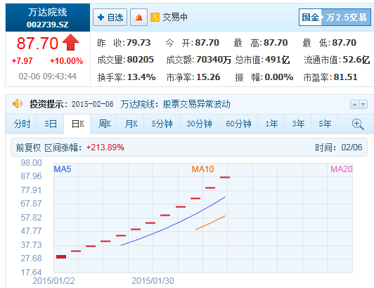 騰訊科技訊 2月6日,萬達院線今日再度漲停。截至目前,萬達院線自從上市,已經連續出現12個漲停,股價報87.7元,總市值高達491億元,已超過百視通,成為A股傳媒產業市值最高的股票。