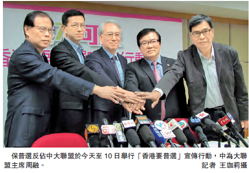 「保普選反占中」大聯盟由今日起至下周二(10日),一連五日組織義工上街、發動聯署團體向其所屬會員及動員聯署團體在舉辦活動期間派發宣傳單張,亦會動員聯署團體的會員、親友或街坊透過Whatsapp、Wechat、Facebook等網絡平臺,轉發政改宣傳圖片及鏈結,為政改方案通過爭取更多社會民意的支持。大聯盟發言人之一周融指出,常被反對派掛在口邊的「我要真普選」口號,其實只是一個假口號,實為「我要不普選」。他說,現在是關鍵時刻,機不可失,香港人應該站出來發聲,講清楚要普選的訴求。他又說,「占中」行動時,由於香港人發聲,最終獲得了勝利。