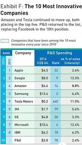 我們都知道,要保持客戶對產品的熱情,只有不斷創新,拉開與競爭對手的距離。那麼,蘋果的研發和創新在能夠確保一直領先于競爭對手嗎?在這一點上,蘋果的投入並不令人滿意。根據彭博社2014年的資料,蘋果的研發費用只是整體銷售收入的2.6%,在列出的10個創新企業中研發比例是最低的。研發費用的絕對值低於主要競爭對手谷歌、亞馬遜、微軟,甚至只有三星的1/3。