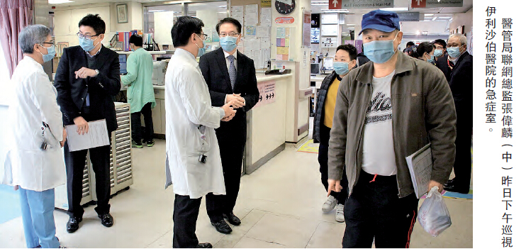 醫管局聯網服務總監張偉麟及伊利沙伯醫院副行政總監何曉輝,昨日下午巡視伊利沙伯醫院的急症室並召開記者會。張偉麟形容踏入冬季流感高峰期以來,情況嚴峻。數字顯示,每天求診人數當中,逾1000人經急症室送到內科病房,導致內科病房病床率高達110%,上月尾亦錄得最高峰的117%,需加床容納病人。