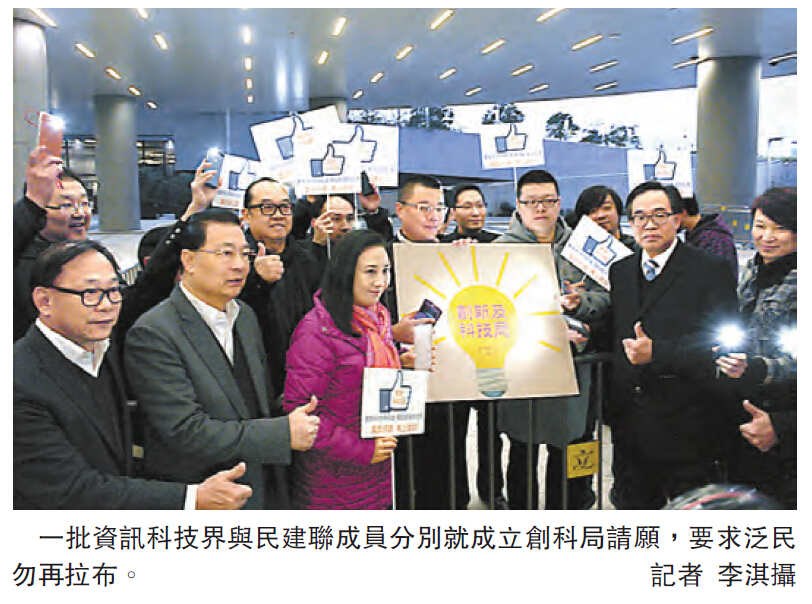 另外,數十名民建聯成員以及「爭取創科局聯盟」昨日分別在立法會示威區請願,要求反對派停止「拉布」,財委會盡快通過成立創科局撥款申請。聯盟成員亮起手機燈,象徵燃亮創科局以及公義之光,促請財委會盡快通過撥款,並指其他界別都支持成立新局,批評泛民為針對行政長官梁振英而辜負民意,完全不符合邏輯。