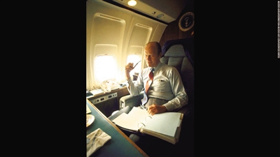 布什(1989年-1993年)1990年,喬治·H·W·布什接受記者采訪。這架波音747當年開始服役,至今已經載過4位總統。
