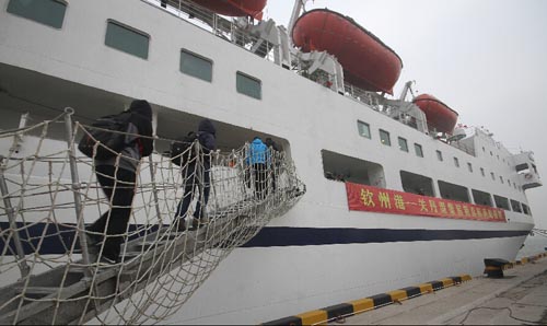 2月8日,中國廣西欽州港─馬來西亞關丹港集裝箱國際直航班輪正式首航。這條航線從廣西北部灣港的集裝箱樞紐港欽州港區始發,在裝載集裝箱后前往廣西北部灣港的北海港區裝載國際游客,之后一路南下,最終抵達馬來西亞東海岸經濟特區關丹港,單程5天直達。圖為執行該航線的郵輪“北部灣之星”號。