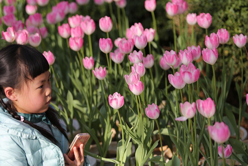 2月8日,小朋友在昆明大觀公園欣賞郁金香。