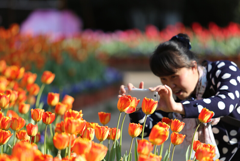 春節臨近,昆明大觀公園新春郁金香吸引眾多游客。 (梁志強 攝)