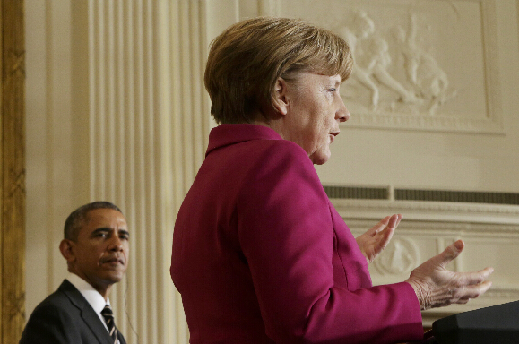2月9日,美国总统奥巴马(右)和到访的德国总理默克尔在美国华盛顿白宫举行会谈。