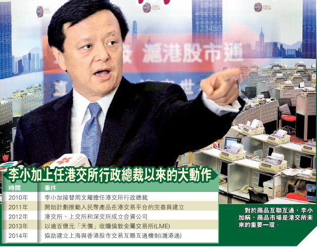 事實上,李小加自上任以來,推行不少新措施推動兩地金融市場融合,當中包括推動人民幣IPO、促港交所與上交所和深交所成立合資公司、開發兩地股票指數產品,如股指期貨等、推動中國資本市場國際化。另外,李小加任內收購倫敦金屬交易所,則是搭建亞洲商品平臺,為未來與內地商品互聯互通鋪路。