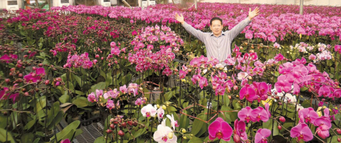 本港「蘭花大王」楊小龍今年推出「金磚富貴」蝴蝶蘭,同樣是在臺灣蘭花展中贏得過金牌獎的蘭花品種。楊小龍表示,「金磚富貴」是公司鎮店之寶,只供觀賞而不出售,由於今年天氣好,蘭花生產成本未有大增,預計今年與去年相同,能售出3萬至4萬棵蘭花,而受客戶喜歡的蘭花品種每枝100元有售。