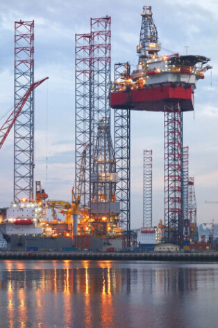 ▲6图:6月4日,大船重工新建成的一座400英尺自升式鑽井平台JU2000E在作升降試驗。