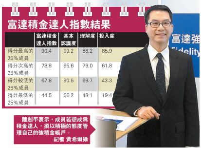 富達國際投資香港區機構業務主管陸劍平昨指出,該指數顯示大部分成員都對強積金有一定認知,但他們對這一計劃的理解水平不高,每五位受訪者中有四位未能充分理解強積金供應商、僱主和僱員的權責。他又指,成員對強積金的投入程度亦不夠積極,在過去一年曾搜尋強積金資料的成員僅有五成,曾閱讀成員權益報表的受訪者不足六成,沒有接觸過供應商的受訪者則多達七成。