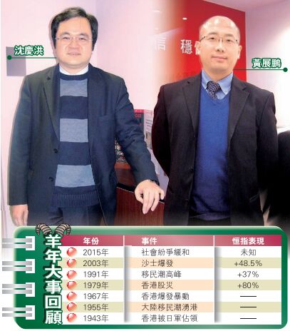 板塊方面,Patrick說,羊年土、火重,金、水弱,土旺有利基建和建築行業,火旺利好科技類股份,如網絡和電腦公司;金弱不利金融行業。Stephen則看好農業股和醫藥股,他說,今年氣候利好農業收成,加上其他板塊已輪流炒上,反觀農業股相對落後,有望成下一個追捧對象;醫藥股將會是大整合一年,收購合併將不絕於耳。