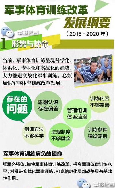 总参谋部、总政治部、总后勤部、总装备部近日联合颁发《军事体育训练改革发展纲要(2015-2020年)》(以下简称《纲要》),系统提出推进军事体育训练改革发展的指导思想、发展目标、主要任务和相关政策。《纲要》指出,军事体育训练是提高官兵身体和心理素质的基本途径,是培育意志品质和战斗作风的有效手段,是促进人与武器装备有机结合、增强战斗技能的重要环节。要准确把握军事体育训练改革发展的指导思想与目标原则,坚持实战牵引,坚持遵循规律,坚持分类指导,坚持创新驱动,形成具有我军特色、符合现代战争特点规律、满足能打仗打胜仗要求的军事体育训练体系。