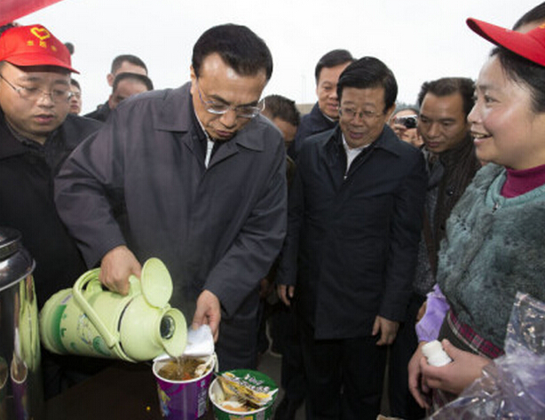 【總理為過年返鄉進城務工人員沖泡速食麵】李克強撕開紙蓋,倒進開水,一碗老壇酸菜面頓時香氣四溢。14日在貴州黎洛高速農民工服務站,總理將泡好的面端給返鄉農民工吳奇。李克強對在場農民工說,這是家鄉的味道,召喚你們儘快回家。國家正加快推進新型城鎮化進度,讓西部進城務工人員儘早就近就業。