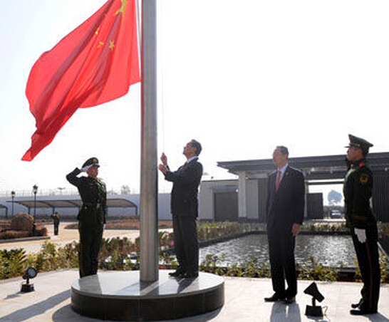 在雄壯的國歌聲中,王毅親手升起五星紅旗,宣告我駐巴基斯坦使館新館落成