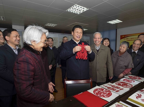 活動室里展示著社區居民的書畫和剪紙作品。總書記仔細欣賞,予以肯定。總書記拿起一幅“三陽開泰”剪紙,在新聞記者的鏡頭前展示。他表示,這是廣大人民群眾對國泰民安、生活幸福的期盼,祝愿全國各族人民新春愉快、羊年大吉,生活喜氣洋洋,事業蒸蒸日上。