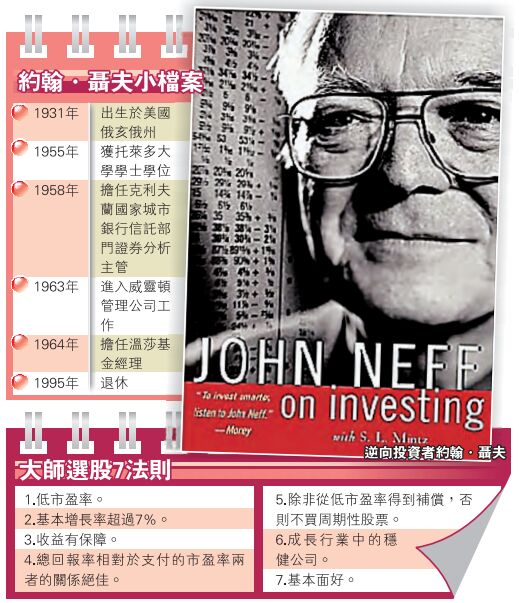 約翰·聶夫在華爾街有「專家中的專家」之稱,他所管理的溫莎基金在31年中曾22度跑贏大市,總收益率達55倍。他在《John Neff on Investing(約翰聶夫談投資)》一書中分享道,成功背后的法則便是長期在低位買入市盈率低、基本面好的股票,再在合適的時機售出。說來實在簡單,但難就難在堅持。