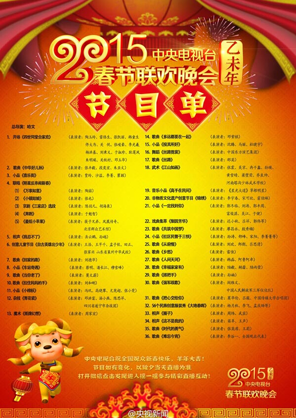 2月17日凌晨,央視春晚官方微博發布節目單,并稱:“【春晚節目單權威發布】經過羊年春晚六次彩排后的節目調整與修改,2015年中央電視臺春節聯歡晚會權威敲定版節目單今夜出爐!節目如有變化,以除夕當天直播為準。中央電視臺祝全國觀眾新春快樂,羊年大吉!轉發收藏之!”