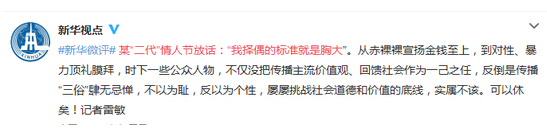 #新華微評# 某“二代”情人節放話:“我擇偶的標準就是胸大”。從赤裸裸宣揚金錢至上,到對性、暴力頂禮膜拜,時下一些公眾人物,不僅沒把傳播主流價值觀、回饋社會作為一己之任,反倒是傳播“三俗”肆無忌憚,不以為恥,反以為個性,屢屢挑戰社會道德和價值的底線,實屬不該。可以休矣!記者雷敏