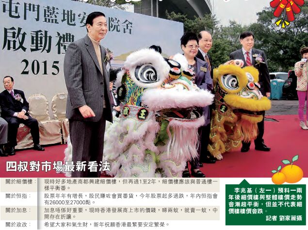 此外,李兆基一向睇股眼光獨到,今次他主動提起對股票市場的看法。他預期,年內恒指有機會見26000至27000點,全年睇股市「起多過跌」,股票上升機會較下跌為多,原因是股票年年都有增長,股民賺取利息後,會選擇再入貨支撐大市。他強調現時股票有折讓,即使市場普遍預期美國年內有機會加息,但他認為,「加息唔係好重要,發展商上市的價錢,睇兩蚊,就賣一蚊,中間存在折讓」。