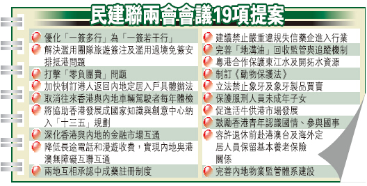 民建聯主席兼政協委員譚耀宗、副主席兼政協委員彭長緯、副主席兼港區人大代表陳勇、黨團召集人兼港區人大代表葉國謙、人大代表及立法會議員兼政協委員陳鑑林昨日召開記者會,提出一共19項提案(見附表),涉及到優化本港旅游業、加強兩地融合、保障食物安全、完善保護動物的法例及鼓勵青年認識國情等多個方面。