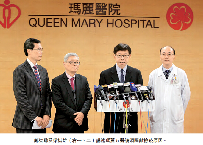 本港早前確診入冬以來第3宗外地傳入H7N9禽流感個案,衛生防護中心昨午召開記者會簡介最新情況。瑪麗醫院感染控制主任鄭智聰表示,經詳細跟進記錄,患者入院后共有82位醫護人員照顧過他,其中5名醫護人員曾經為他「插喉」,以助他呼吸,包括1名醫生、2名護士、1名病房助理及1名手術室助理。