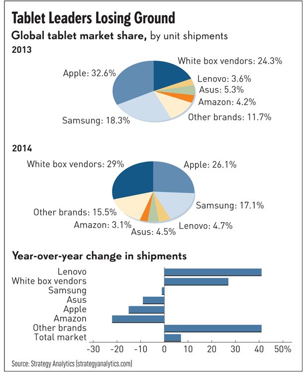 Strategy Analytics的研究結果顯示,蘋果和三星平板電腦在2014年不敵聯想和白牌平板電腦(white box,即沒有注冊品牌的產品)。白牌平板2014出貨量為7000萬部,占整個市場平板市場的29%。