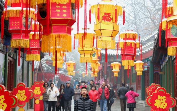 遊客在北京懷柔紅螺寺旅遊景區遊玩(2月21日攝)。新華社發(卜向東 攝)