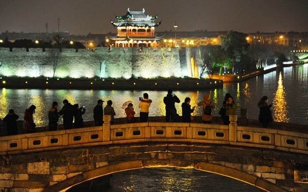 遊客在蘇州護城河畔古覓渡橋上欣賞夜景(2月21日攝)。新華社發(王建中 攝)