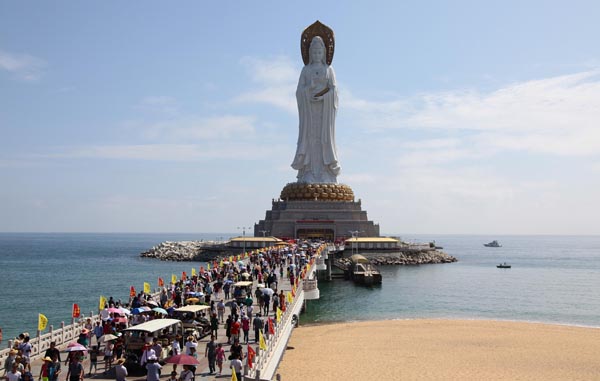 遊客在海南省三亞市南山佛教文化苑海上觀音廣場參觀遊覽(2月23日攝)。新華社發(陳文武 攝)