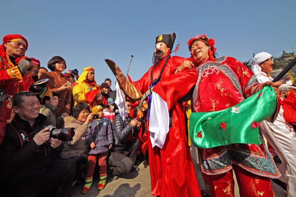 遊客在山東煙臺毓璜頂廟會上欣賞民間藝人的鄉村滑稽戲表演(2月24日攝)。新華社發(唐克 攝)