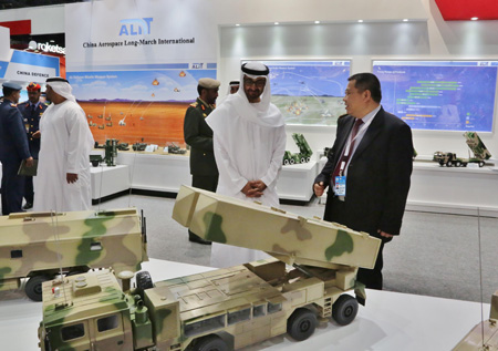 2月26日,在阿联酋首都阿布扎比,中国保利科技公司参展代表(前左)向阿布扎比王储兼阿联酋武装部队副总司令谢赫穆罕默德·本·扎耶德·阿勒纳哈扬(前右)介绍该公司的产品。