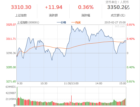 網易財經2月27日訊 今日兩市小幅低開後震蕩上行,滬指重回3300點。臨近午盤,兩市強勢拉升。午後,滬指在3300點上方震蕩。截至收盤,滬指漲0.36%,報3310.30點,成交3350億;深成指漲0.06%,報11757.7點,成交2881億。