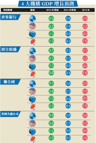 美國彭博社26日報道稱,該社就2015年各經濟體經濟增速針對經濟學家進行了一項調查,結果顯示,未來兩年內,亞洲與非洲的新興經濟體增速仍將領跑全球,而尽管中國經濟增速不比往年,其仍將是G20國家中增速最快的經濟體,預計2015年增速將降至7%。該調查顯示,今年全球經濟預計增長3.2%,明年則增長3.7%。GDP總和約占全球16%的中國、菲律賓、肯尼亞、印度和印度尼西亞的經濟增速預計均會超過5%,而經濟增長總和占全球四分之一的美國和英國預計分別增長3.1%和2.6%,而歐元區經濟增速或只有1.2%。