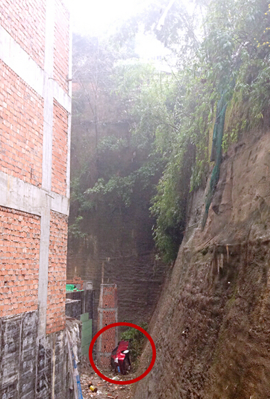 事發地點位於樂山師範學院校內的伍伽山上。昨日下午,成都商報記者趕到現場時看到,保安在現場拉起了警戒線,被撞垮的圍牆有10多米長,1米多高,厚度約10釐米,從圍牆缺口向下看去,有好幾棵竹子被折斷,但看不到事發車輛。隨後,記者繞到與學校一牆之隔的星辰青年廣場工地,發現一輛紅色小轎車側翻在堡坎下,堡坎的高度約有20多米高。