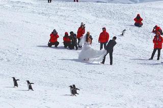 中國遊客在雪地上拍攝結婚照,附近有不少企鵝受驚躲避。