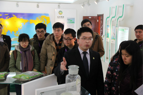 北大博士生服务团的同学们参观河北金木药业集团有限公司的产品展室。