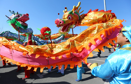 3月3日,民间艺人在天津市西青区中北镇的花会展演上舞龙。
