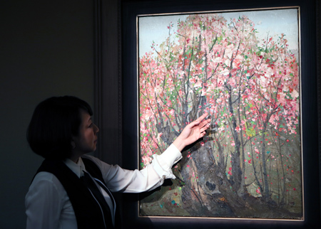 3月5日,香港苏富比现代亚洲艺术部主管张嘉珍向记者介绍即将亮相春季拍卖会的吴冠中“生命的风景”专题作品之一《红梅》,这幅作品估价为3500万-4500万港元。