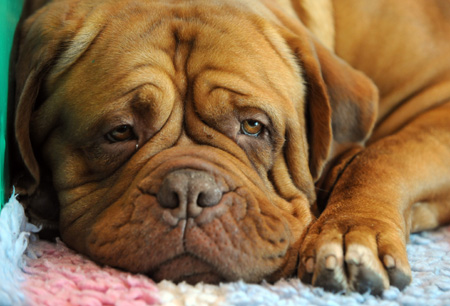 3月6日,在英国伯明翰举行的克鲁弗兹狗展上,一只波尔多犬准备参加比赛。
