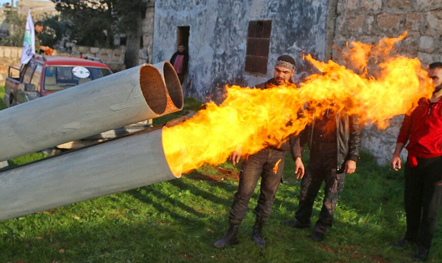 据英国《每日邮报》3月8日报道,叙利亚反对派联盟Shamiyah Front武装近日在阿勒颇乡下的工厂里拼凑出了一种名为“Borkan”(有“火山”之意)的土制大炮。“Borkan”拥有四根炮管,射程达两英里(约合3.2千米),炮管由气瓶制成,装在卸掉挖斗的挖掘机上。Shamiyah Front是反阿萨德政府的武装新近建立的联盟,于两个多月前在叙利亚北部的阿勒颇省结成。曾经获得美国武器援助的叙利亚第一支反动派组织“哈兹默运动”于当地时间3月1日宣布瓦解后也归顺了他们。