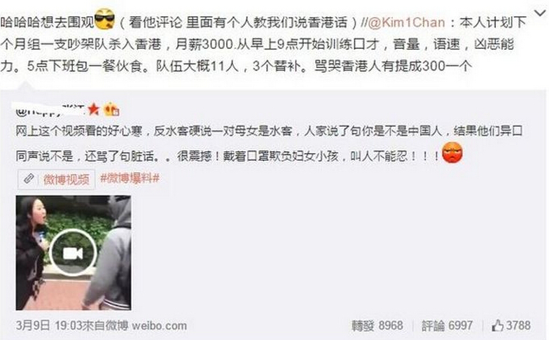有內地網民昨在微博留言,指正計劃下月組織一隊「吵架隊」殺入香港,整個隊伍大約十一人,另有三名替補隊員,「月薪三千,從早上九點開始訓練口才、音量、語速、兇惡能力。五點下班包一餐伙食,罵哭香港人有提成(獎金)三百元一個」,留言附有一個QQ聯絡號碼。雖然該微博帳戶其後迅速刪去有關訊息,但已被內地網民瘋傳,有本港網民稱「放馬過來」。