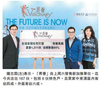 另外,南豐旗下東涌「昇薈」,昨宣布其住客會所正式命名為「VisionnaireClub」。南豐發展地產部總經理鍾志霖於記者會表示,項目自上周六發售新加推單位,迄今共沽出167伙,包括6伙特色戶,且買家中東涌區內客占四成,外區客占六成;項目開售至今累積售出1211伙,占總數的85%;現時全盤尚有200伙餘貨,不排除短期內輕微加價。