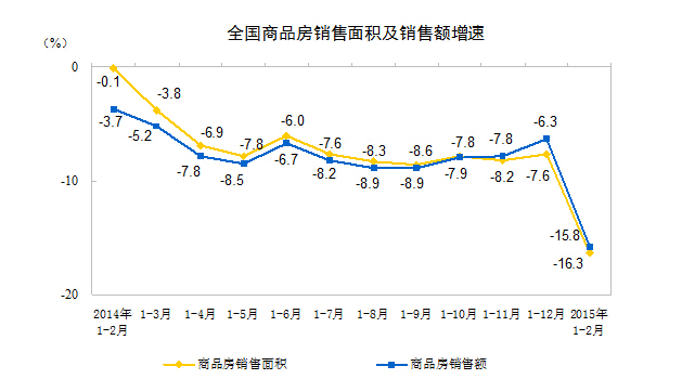 1-2月份,商品房销售面积8764万平方米,同比下降16.3%。其中,住宅销售面积下降17.8%,办公楼销售面积下降4.6%,商业营业用房销售面积增长3.2%。商品房销售额5972亿元,下降15.8%。其中,住宅销售额下降16.7%,办公楼销售额下降15.6%,商业营业用房销售额下降4.0%。