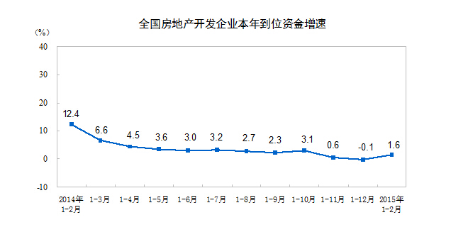 1-2月份,房地产开发企业到位资金21613亿元,同比增长1.6%。其中,国内贷款4942亿元,增长0.6%;利用外资86亿元,增长72.6%;自筹资金9023亿元,增长9.3%;其他资金7563亿元,下降6.0%。在其他资金中,定金及预收款4438亿元,下降10.3%;个人按揭贷款2161亿元,增长2.1%。