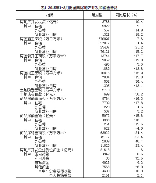 2015年1-2月份,全国房地产开发投资8786亿元,同比名义增长10.4%,增速比去年全年回落0.1个百分点。其中,住宅投资5922亿元,增长9.1%,回落0.1个百分点。住宅投资占房地产开发投资的比重为67.4%。