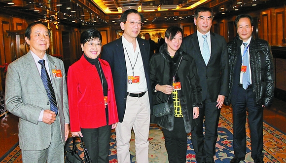 自由党成员昨在京与港澳办主任王光亚会面後向媒体交代情况(左起:杨孝华、刘健仪、胡汉清、周梁淑怡、锺国斌及李子良)。