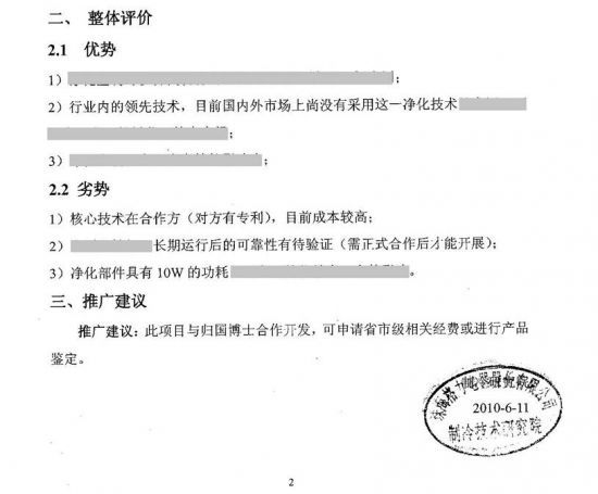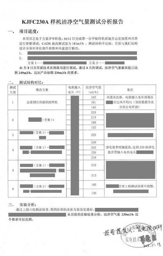 冉宏宇向中國家電網展示了兩份他們收集的文件,一份文件為格力電器家電院四所于2012年11月13日提交的《KJFC230A樣機潔凈空氣量分析報告》,報告顯示,格力原來的產品測試值不達標,但“11月8日貝昂派技術員到我司進行調試,通過4天的調試,潔凈空氣量最高值已達到249m3/h,達到產品標稱230m3/h的要求”;另一份2010年由格力制冷技術研究院的提交的報告則顯示,格力方面分析了格力與貝昂合作的優勢和劣勢,其中優勢有,行業內的領先技術,目前國內外市場上尚沒有采用這一凈化技術;劣勢有核心技術在合作方(對方有專利),目前成本較高,長期運行后的可靠性有待驗證(需正式合作后才能開展)。