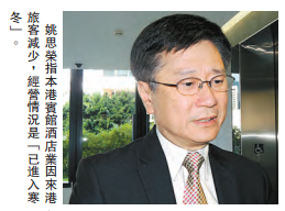 姚思榮昨早出席電臺節目后表示,3月份首星期的旅行團已由去年同期400多團跌至100多團,賓館收入亦跌三至四成,認為本港賓館和酒店業情況「已進入寒冬」。他說,由於近日一連串的反水貨客暴力示威,互聯網上流傳香港不歡迎內地旅客,東南亞旅客也是說普通話的,不排除他們因害怕受牽連而不訪港,預計今年訪港旅客比去年同期下跌百分之五至十。他認為,這不但嚴重影響本港聲譽和旅游業,更影響本港的國際形象。