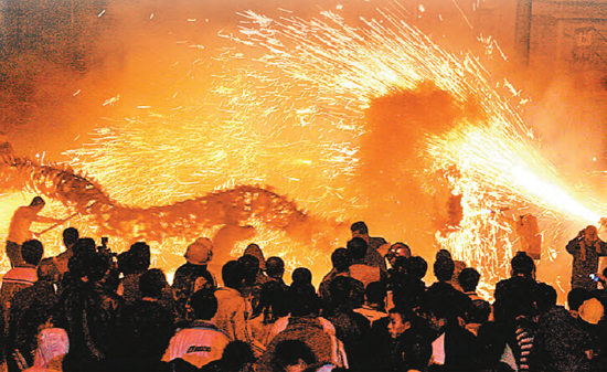 舞龍者在火海中跳躍奔騰