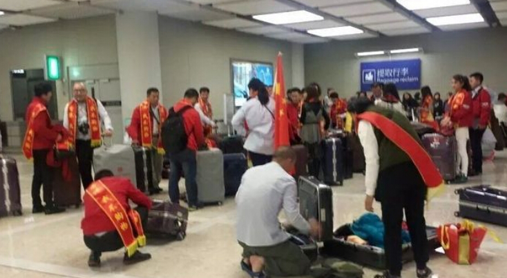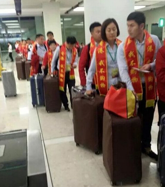 網友@愛港飄在微信上發了幾張相片,見到內地一個去法國的公務團,團友在香港機場過境時,全部人都戴上了寫有「香港,我不購物」字眼的錦帶。這批公務客不單身掛錦帶還帶了國旗,並在過境大堂影大合相。